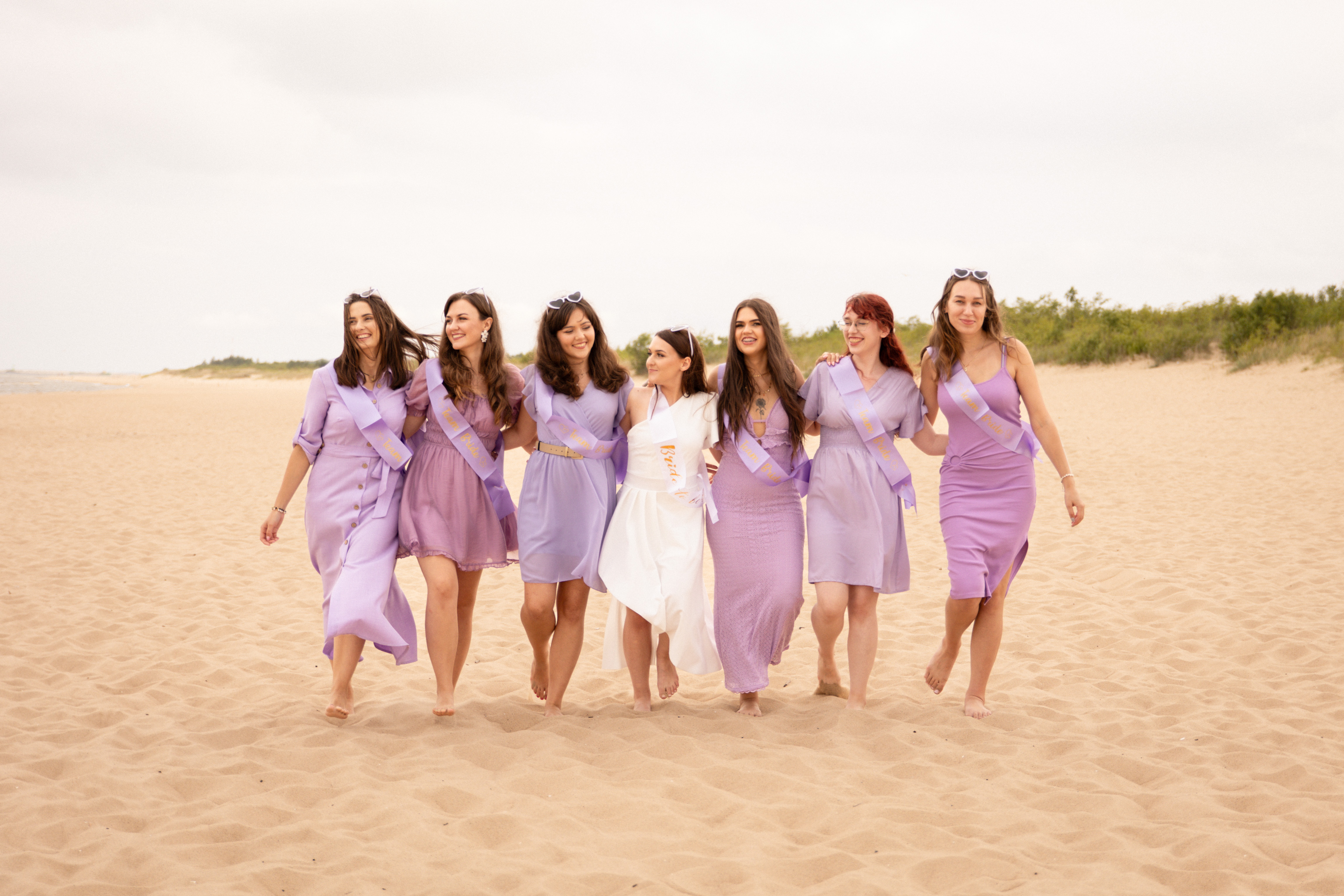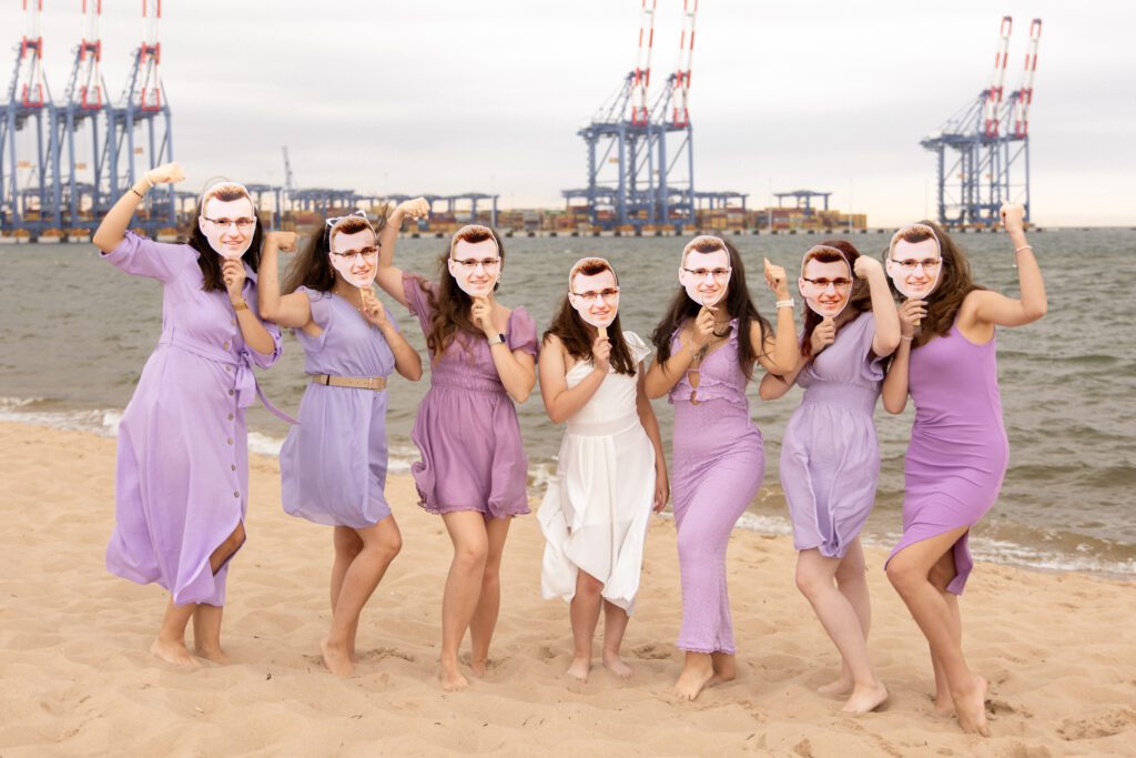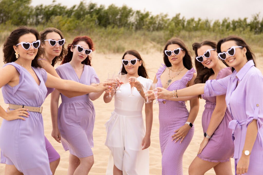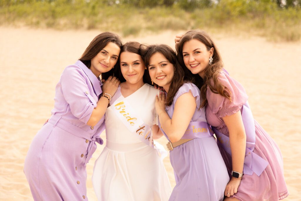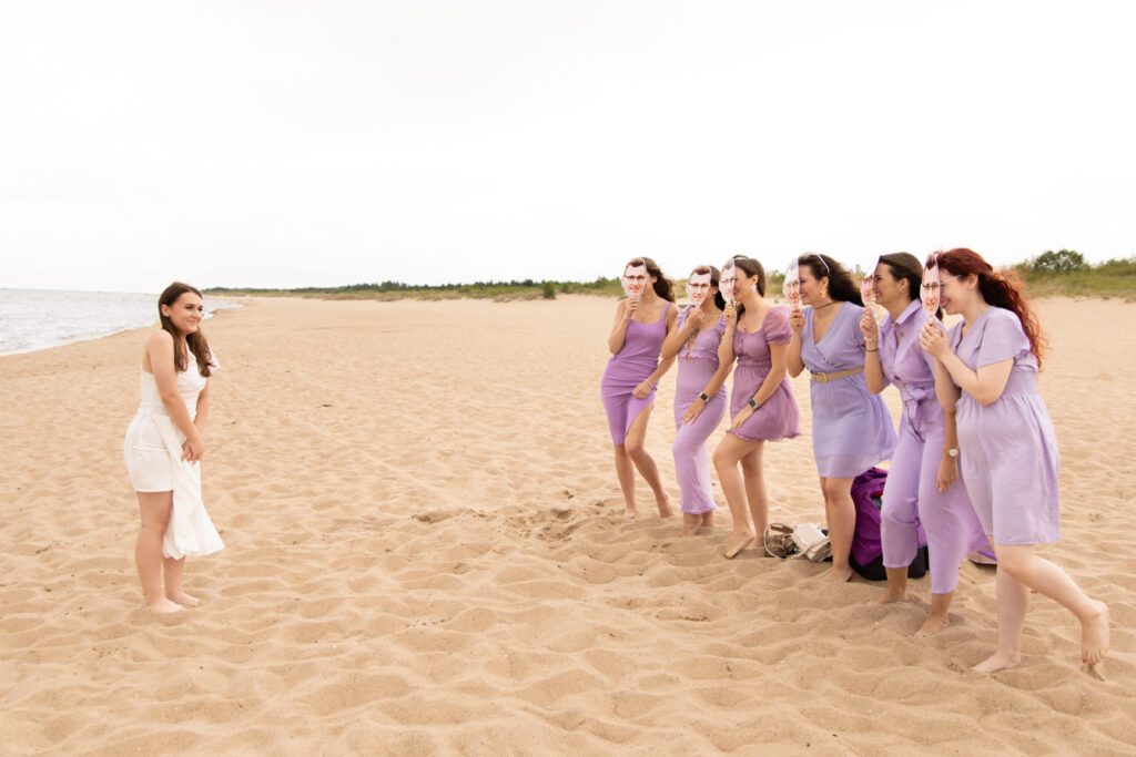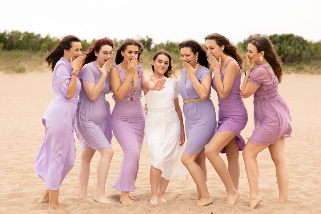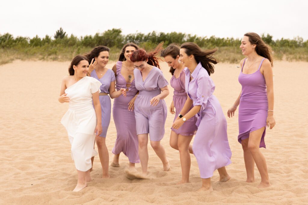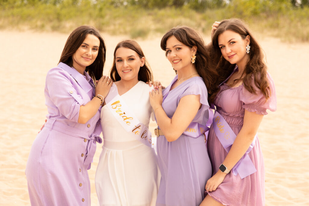 To było zdecydowanie bardzo wietrzne popołudnie 💨. Choć dość szybko się na tej sesji rozgrzałyśmy. Był też dodatkowy plus: miałyśmy całą plaże dla siebie! A to nie zdarza się często w sezonie turystycznym… Często weekendowe wieczory panieńskie na plaży wiążą się niestety z lawirowaniem pomiędzy leżakami i szukaniem skrawka piasku, na którym będziemy mogły zaszaleć 😄. Czasami mamy sporą widownię, ale w większości przypadków da się ją ,,wyfotoszopować” – w przeciwieństwie do oznak czasu oraz dużego obiadu gości weselnych, którzy proszą o retusz ich zdjęć 😂. A wracając do wieczoru panieńskiego Julii… nie uważacie, że ten odcień fioletu niesamowicie pasuje do tego pięknego piasku? 😍