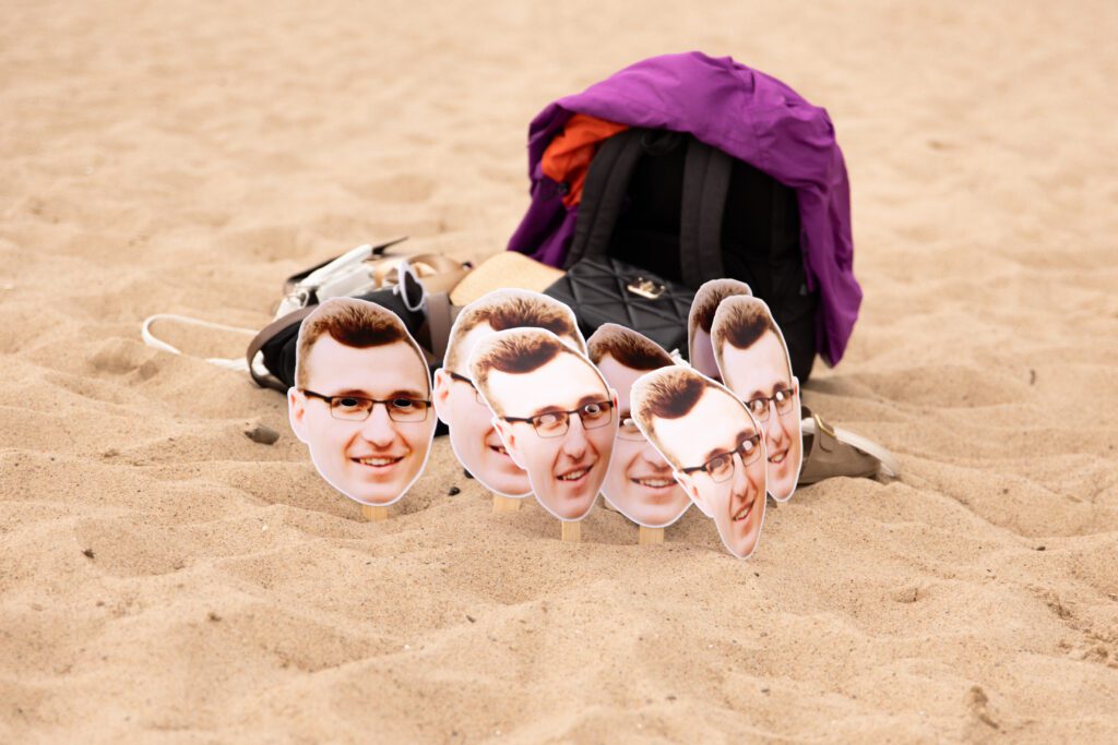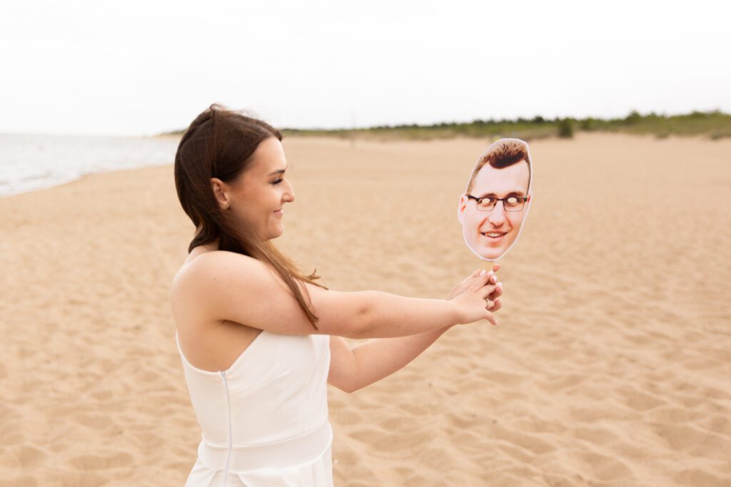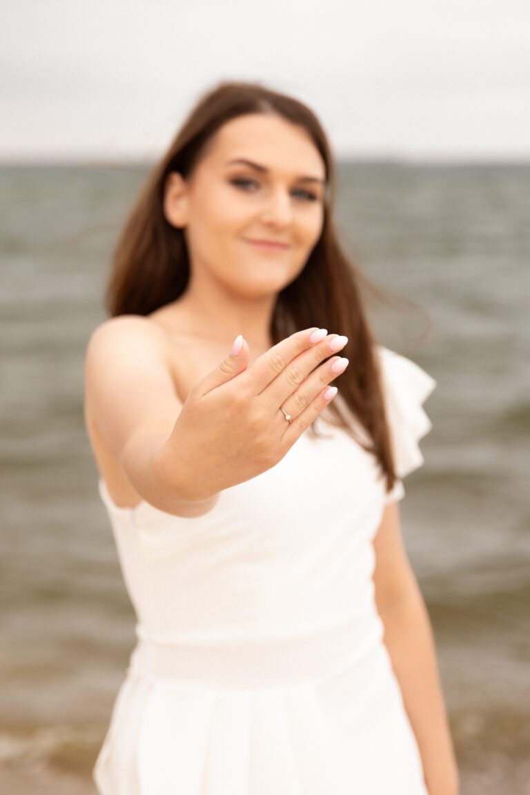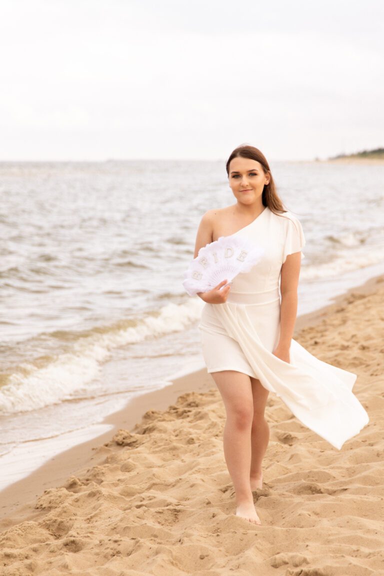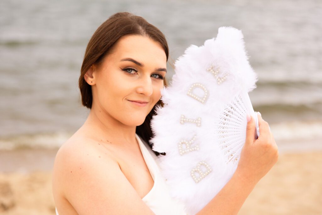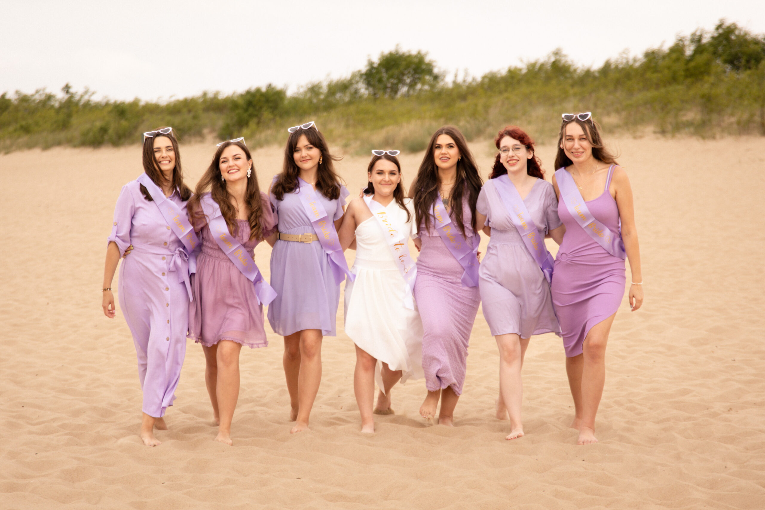 To było zdecydowanie bardzo wietrzne popołudnie 💨. Choć dość szybko się na tej sesji rozgrzałyśmy. Był też dodatkowy plus: miałyśmy całą plaże dla siebie! A to nie zdarza się często w sezonie turystycznym… Często weekendowe wieczory panieńskie na plaży wiążą się niestety z lawirowaniem pomiędzy leżakami i szukaniem skrawka piasku, na którym będziemy mogły zaszaleć 😄. Czasami mamy sporą widownię, ale w większości przypadków da się ją ,,wyfotoszopować” – w przeciwieństwie do oznak czasu oraz dużego obiadu gości weselnych, którzy proszą o retusz ich zdjęć 😂. A wracając do wieczoru panieńskiego Julii… nie uważacie, że ten odcień fioletu niesamowicie pasuje do tego pięknego piasku? 😍
